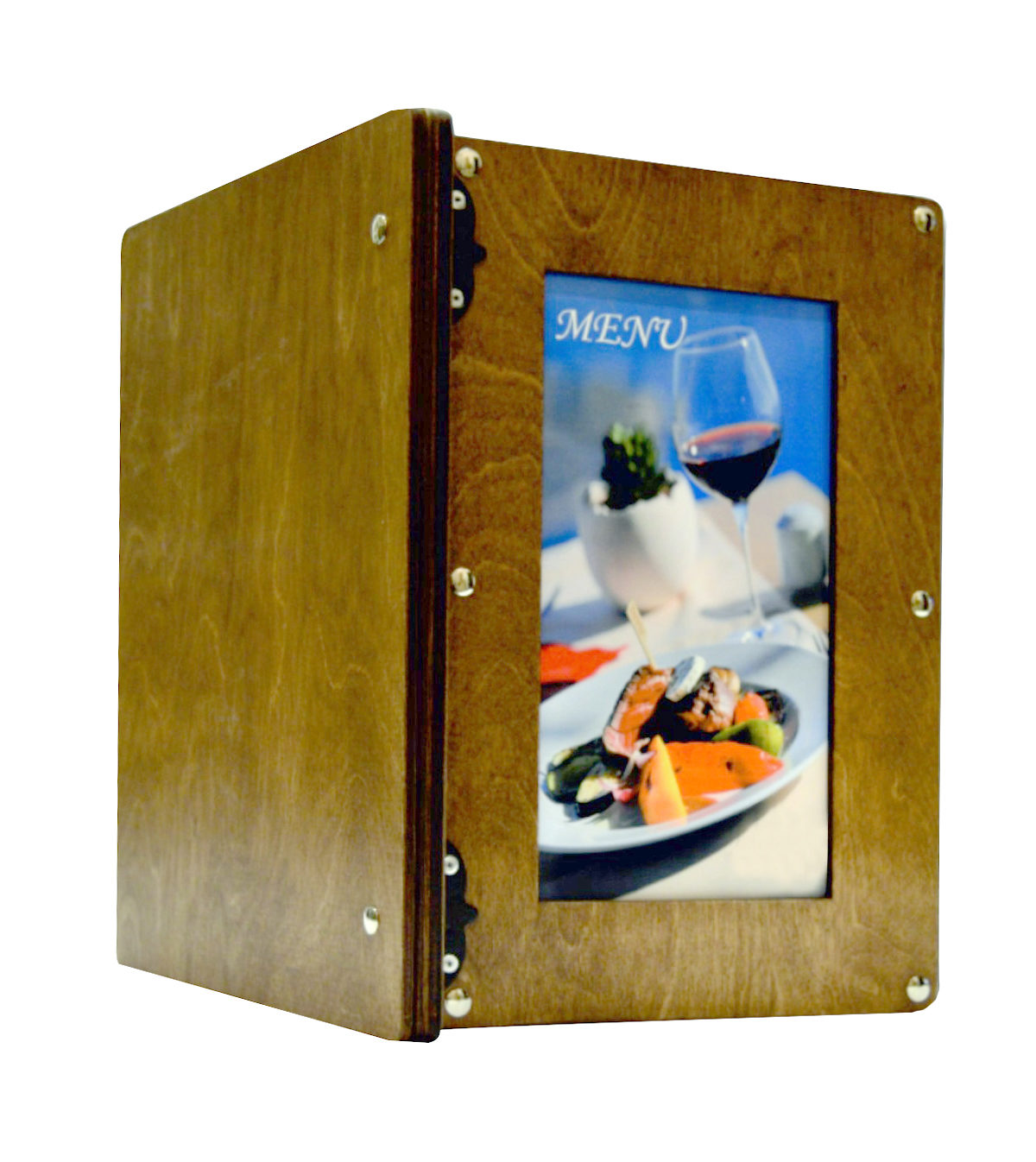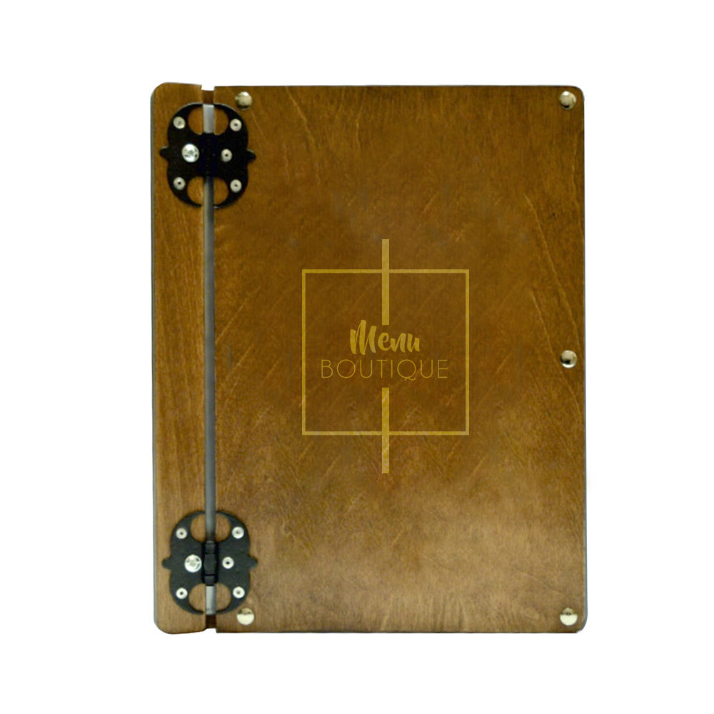 Le menu est constitué de bois contreplaqué d’une épaisseur de 4mm et verni, avec sur la couverture plusieurs personnalisations possibles : avec ou sans plaques, gravure laser ou bien une couverture vierge.