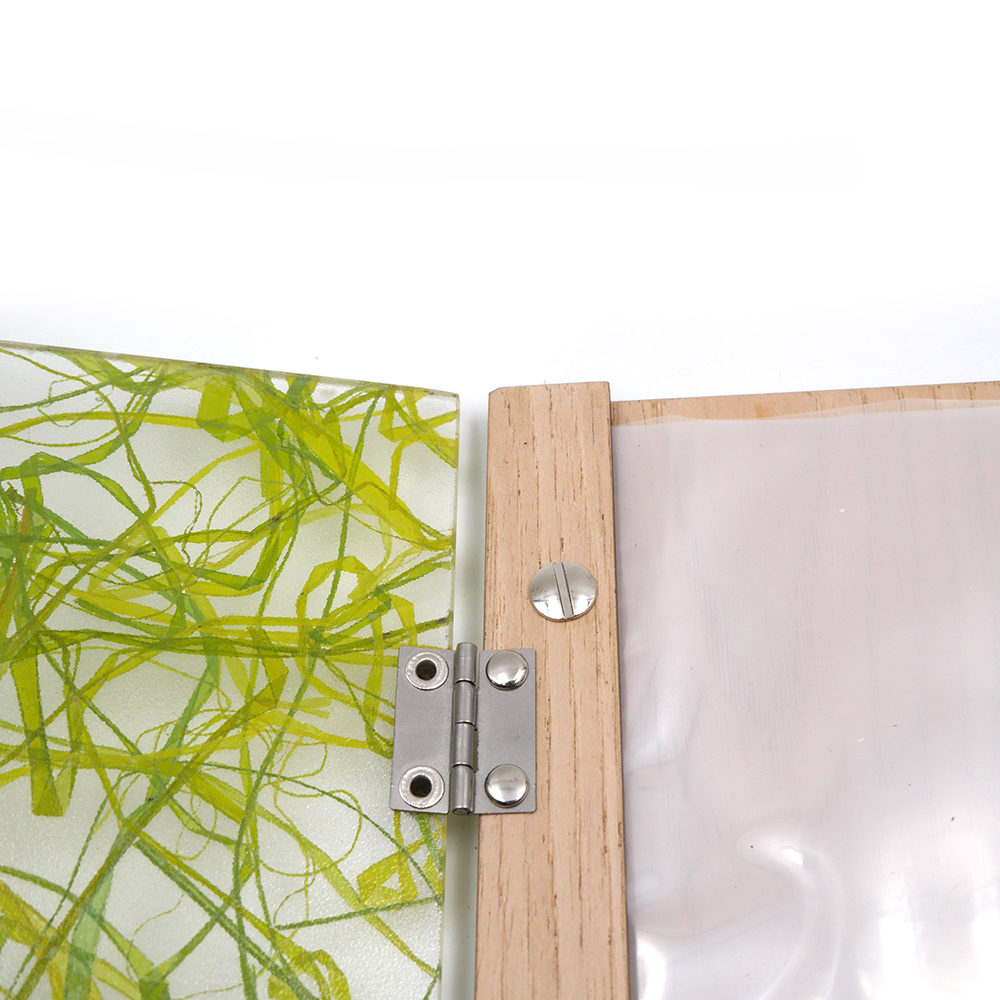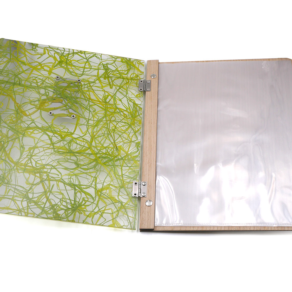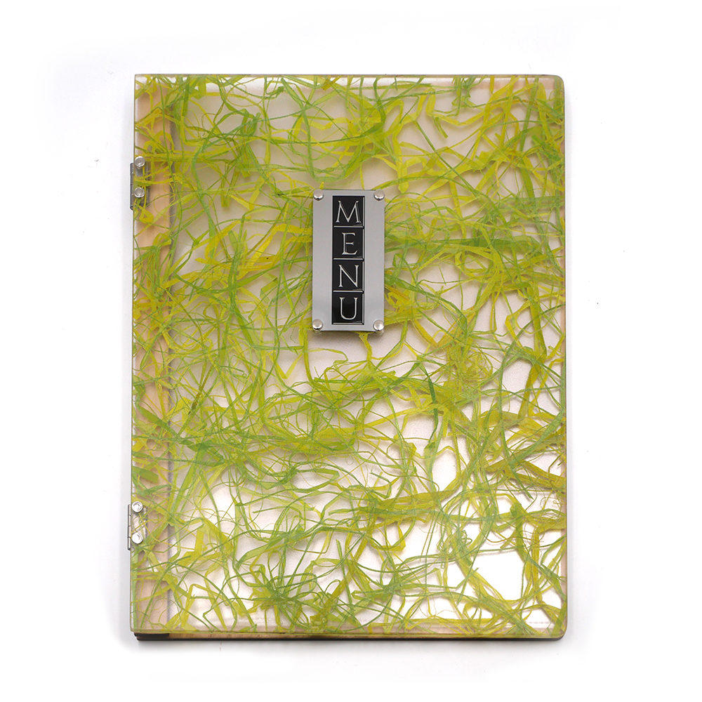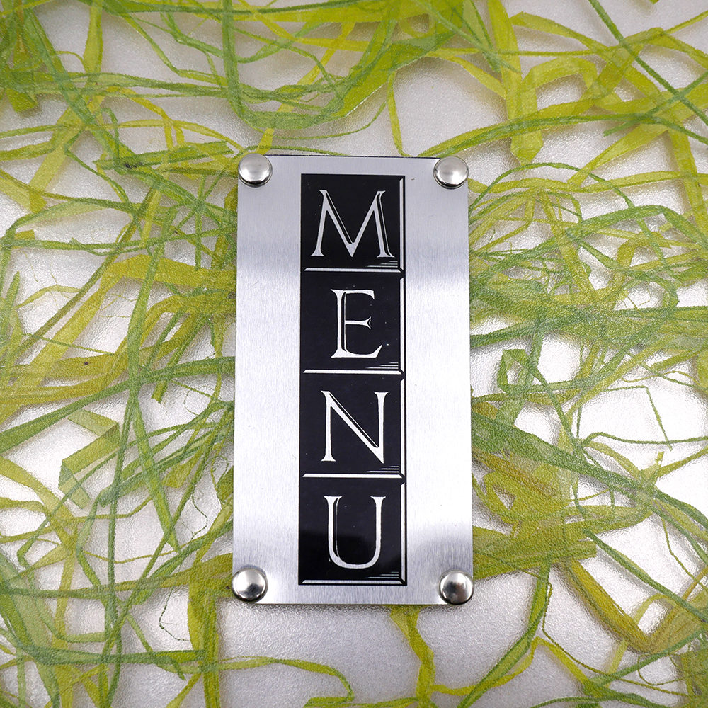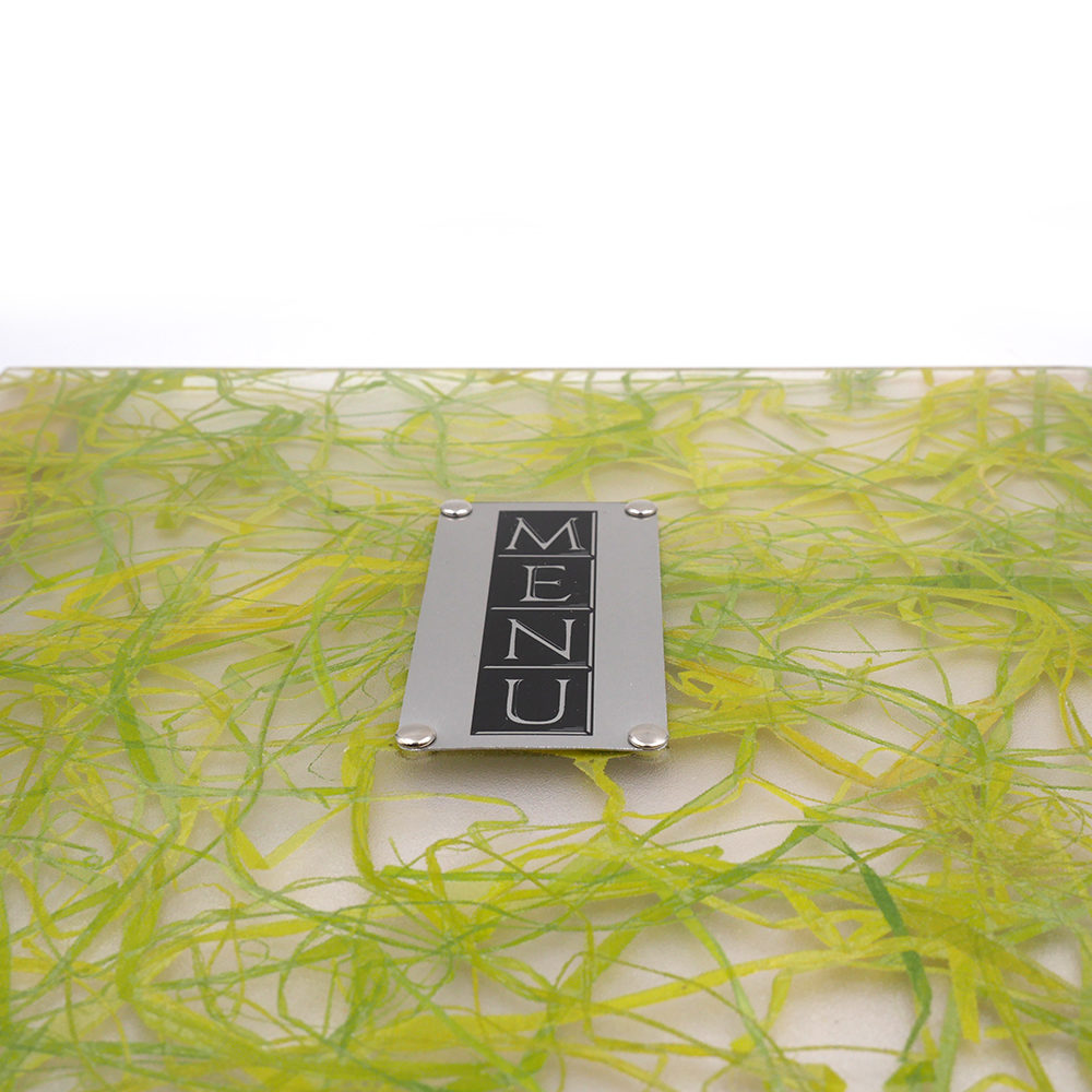 Le porte-menu possède la particularité d’avoir sur sa couverture sous le plexiglas de l’herbe verte fraîchement coupée, donnant à l’ensemble un style unique. Le tout rehaussé par une plaque discrète en métal argenté, la touche finale à l’ensemble !