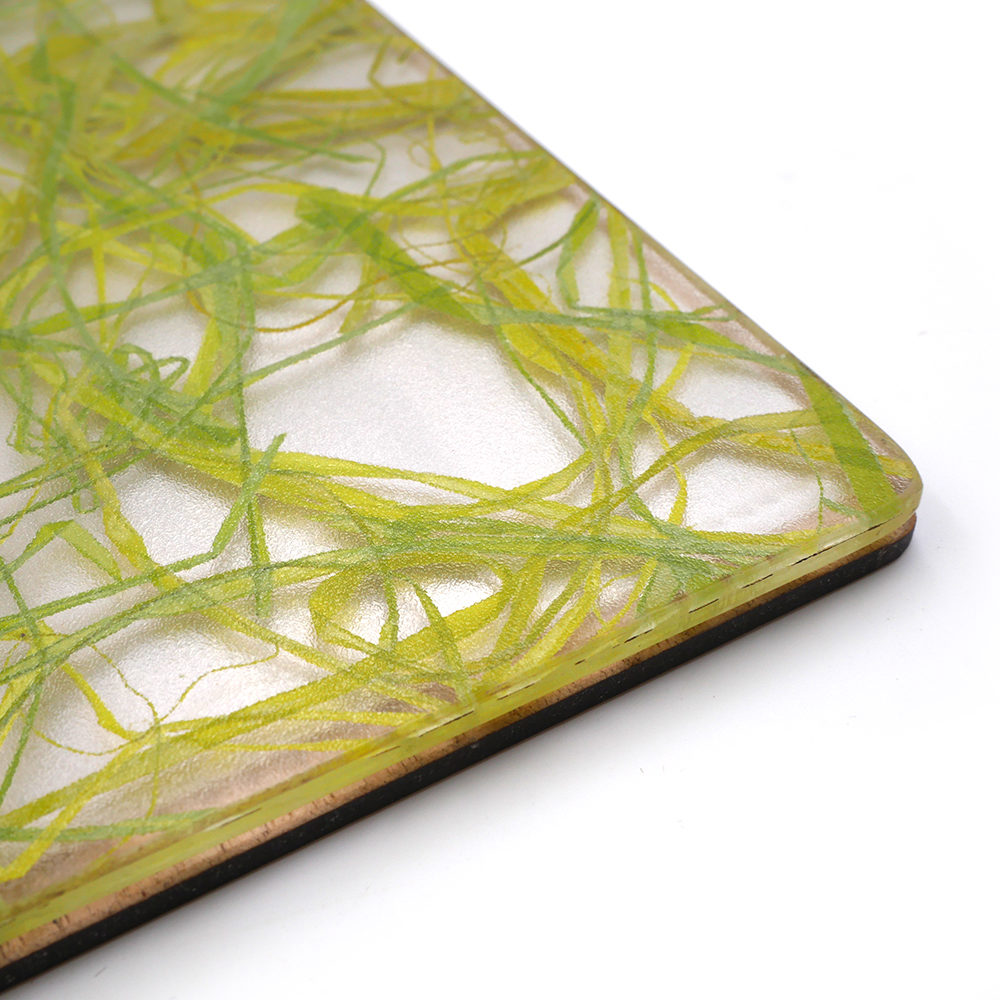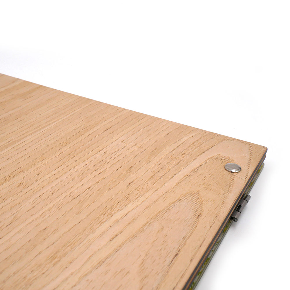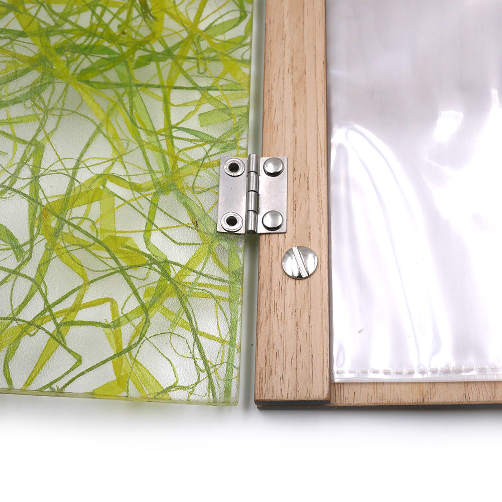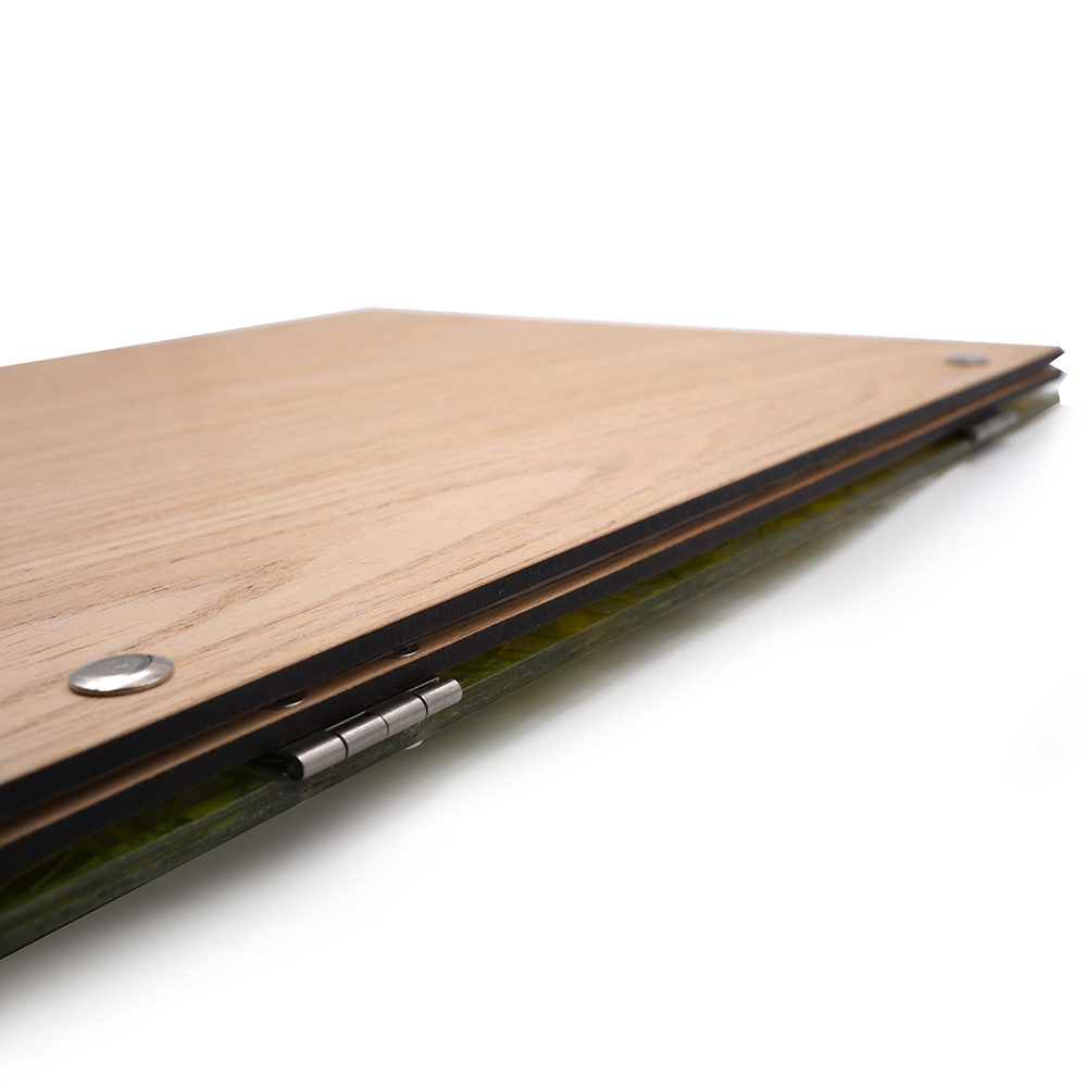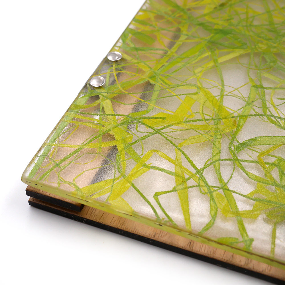 Le porte-menu possède la particularité d’avoir sur sa couverture sous le plexiglas de l’herbe verte fraîchement coupée, donnant à l’ensemble un style unique. Le tout rehaussé par une plaque discrète en métal argenté, la touche finale à l’ensemble !