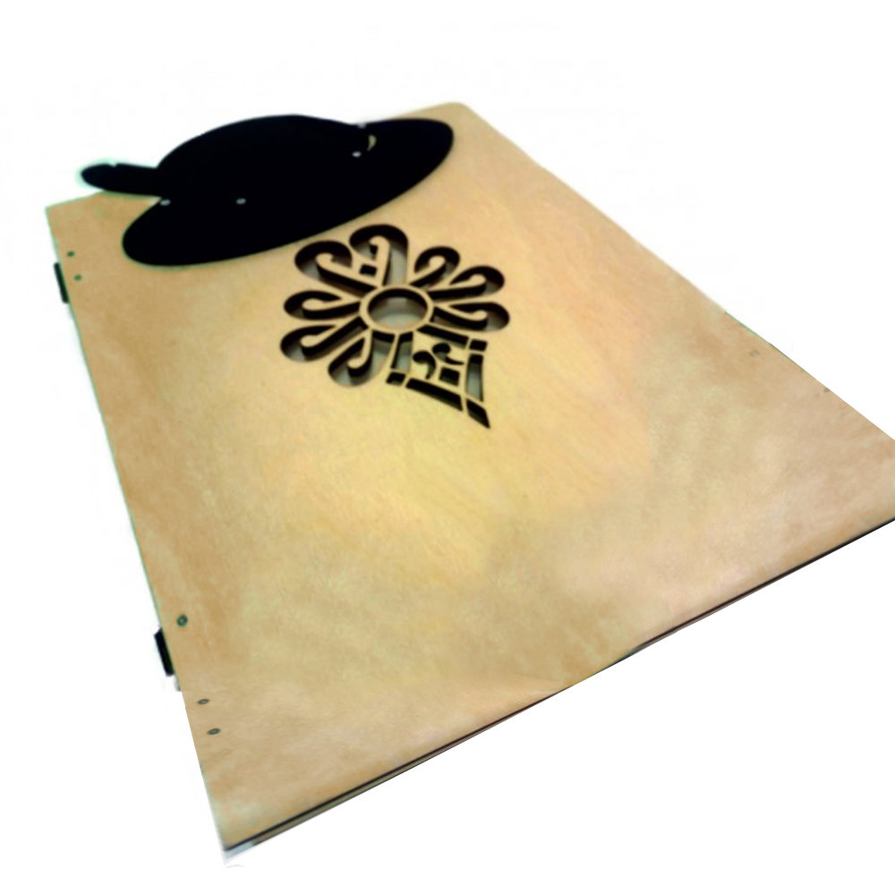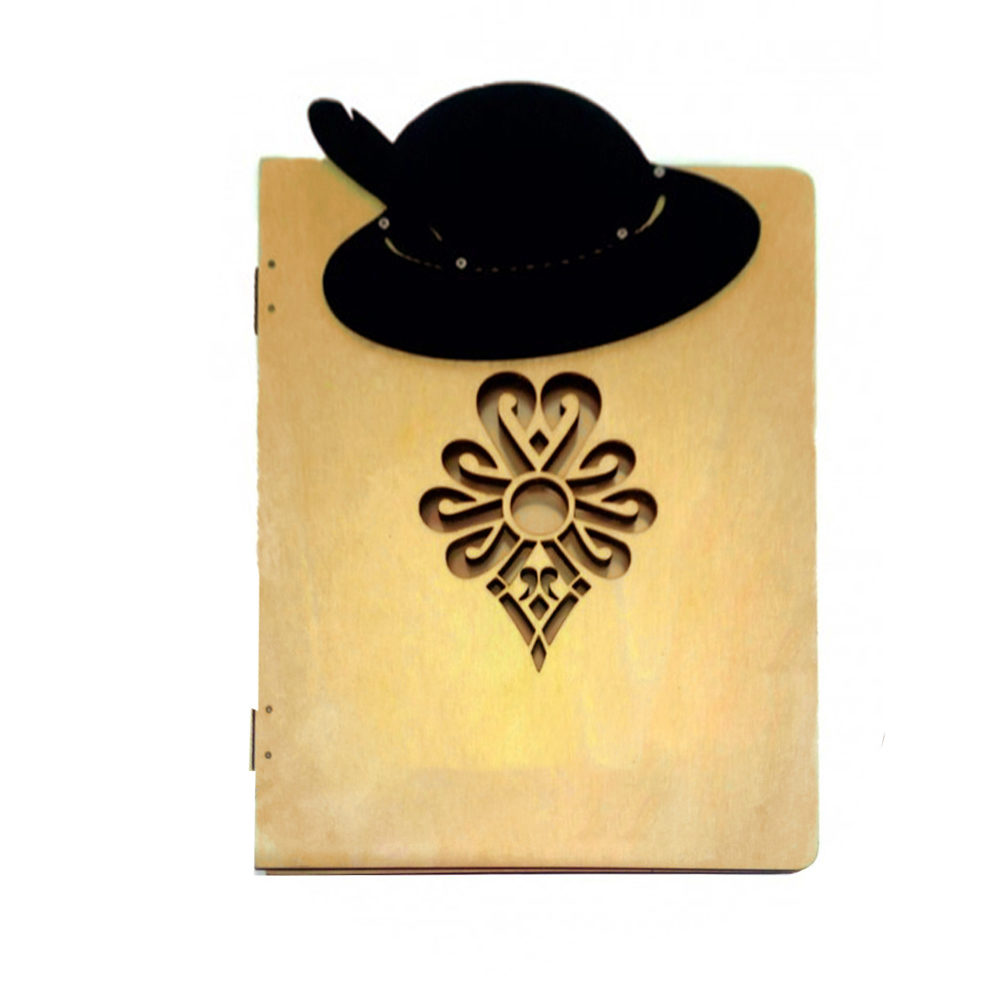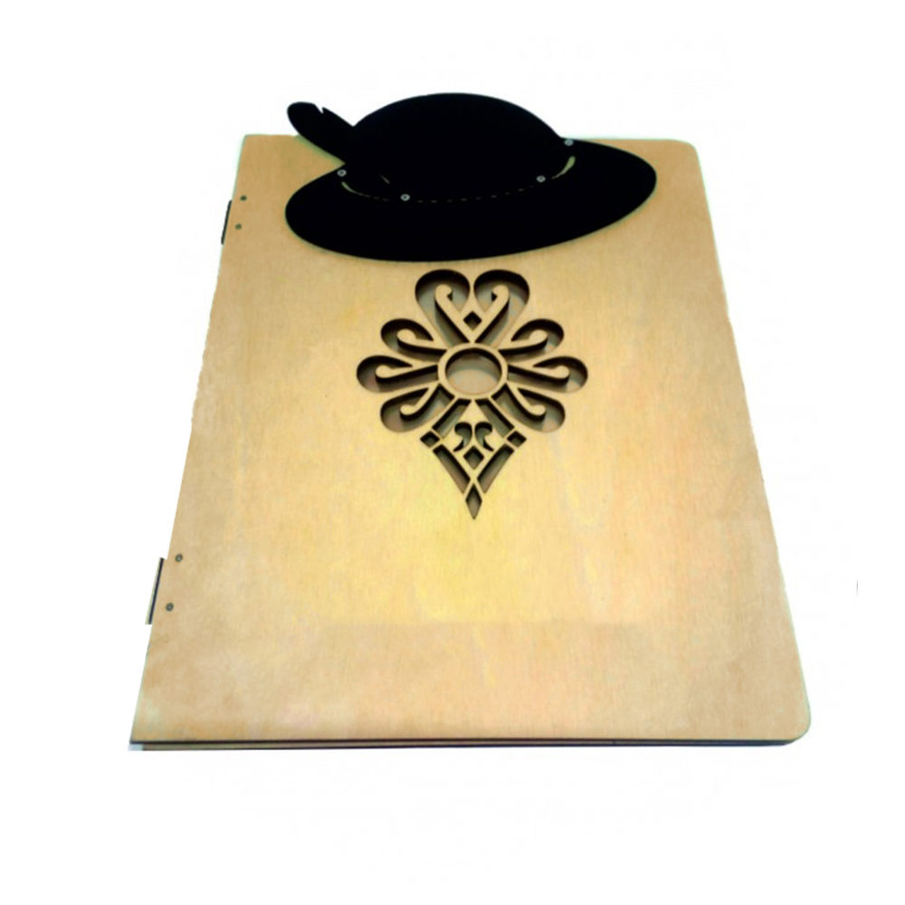 Ce menu en bois naturel contient une très belle gravure sur sa couverture et un chapeau de berger en bois sombre. Pas d’inquiétude sur sa robustesse, le chapeau est solidement soudé à la couverture en bois contreplaqué d’une épaisseur de 5mm. Vous pouvez la personnaliser avec votre logo en gravure laser.