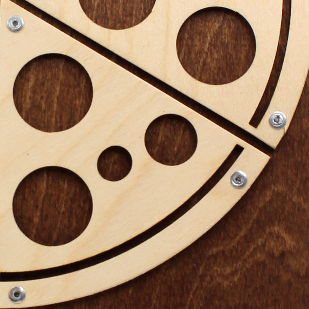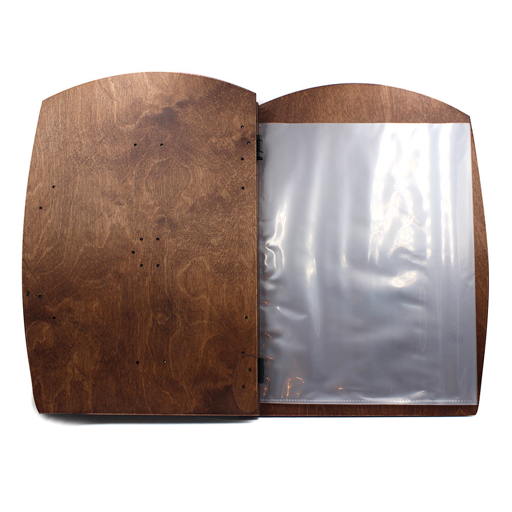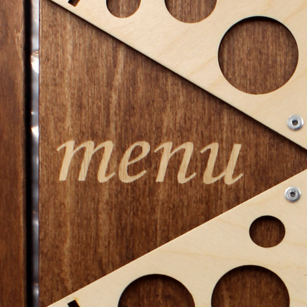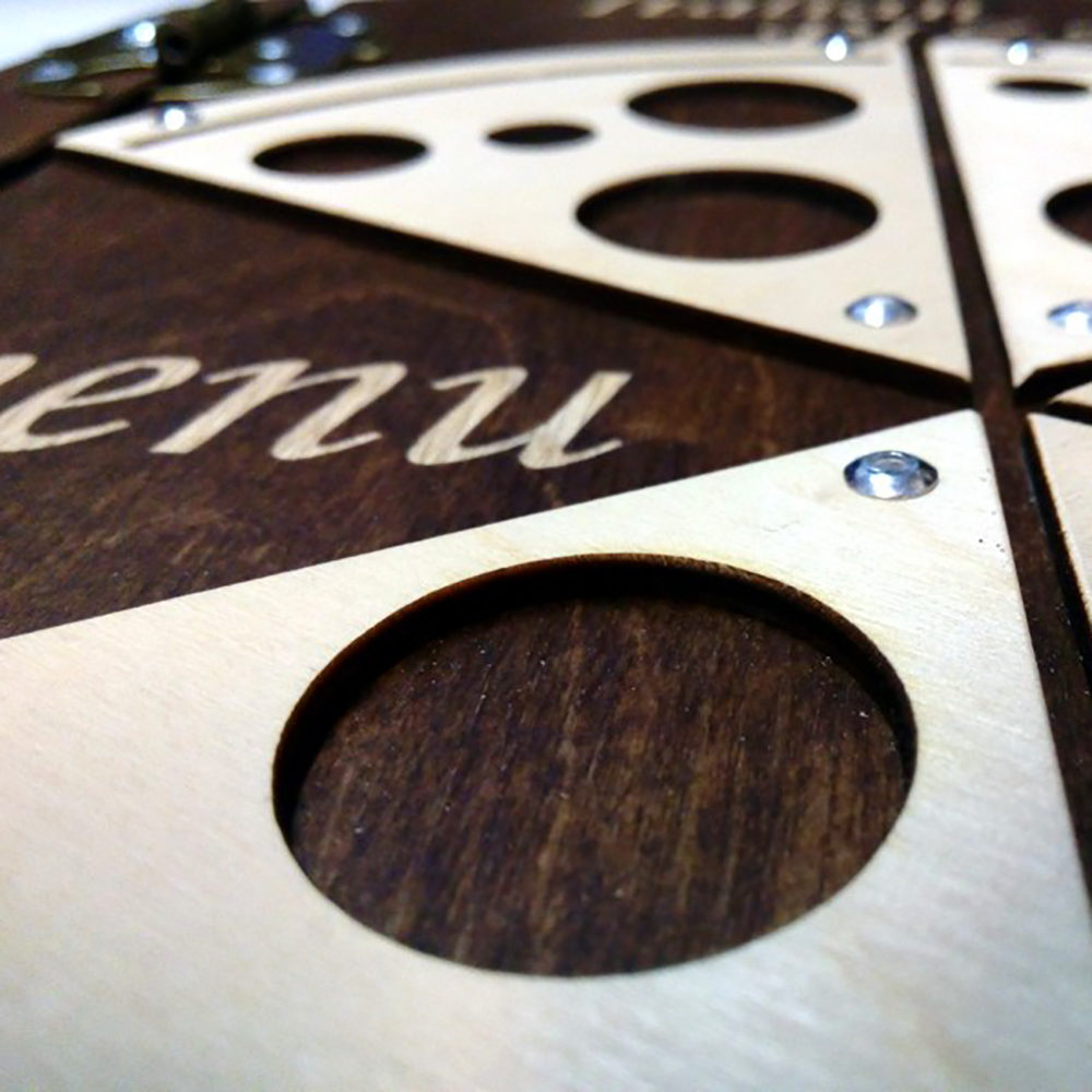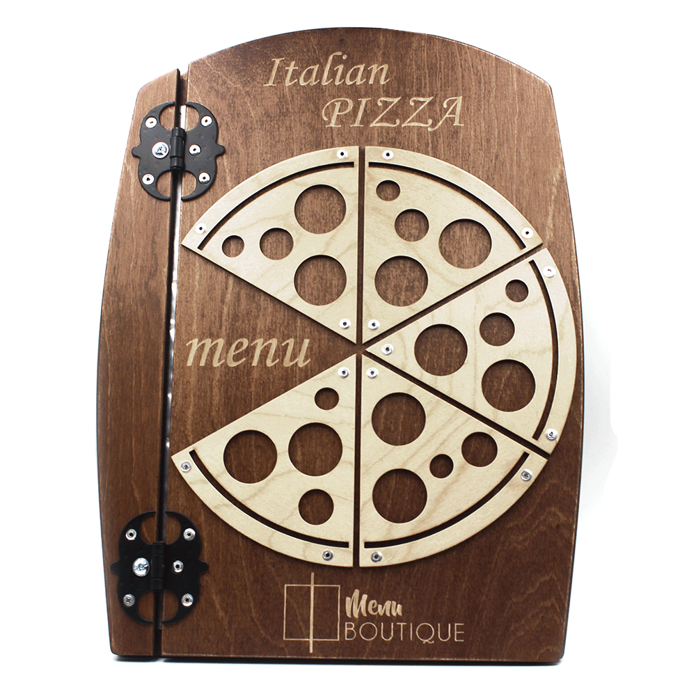 Le menu Pizza est fait de bois contreplaqué d’une épaisseur de 5mm. Il comprend 5 feuilles plastiques (55 microns).