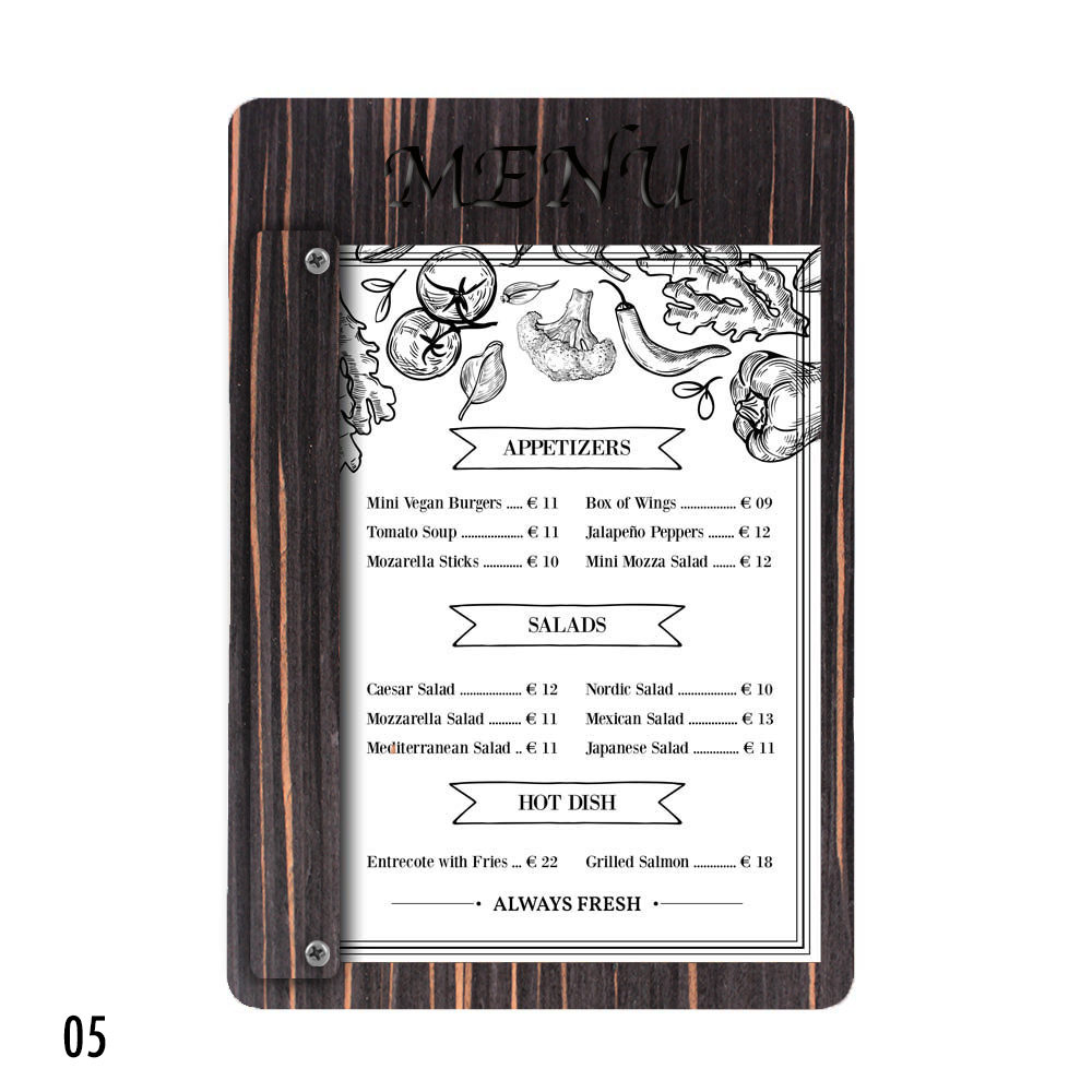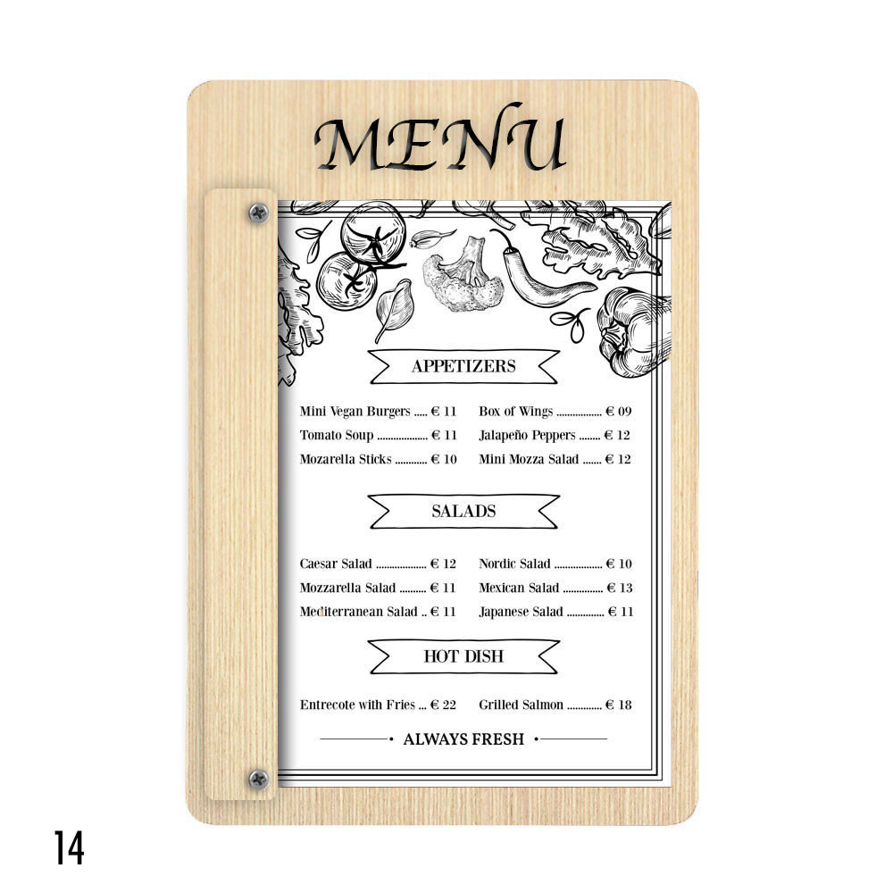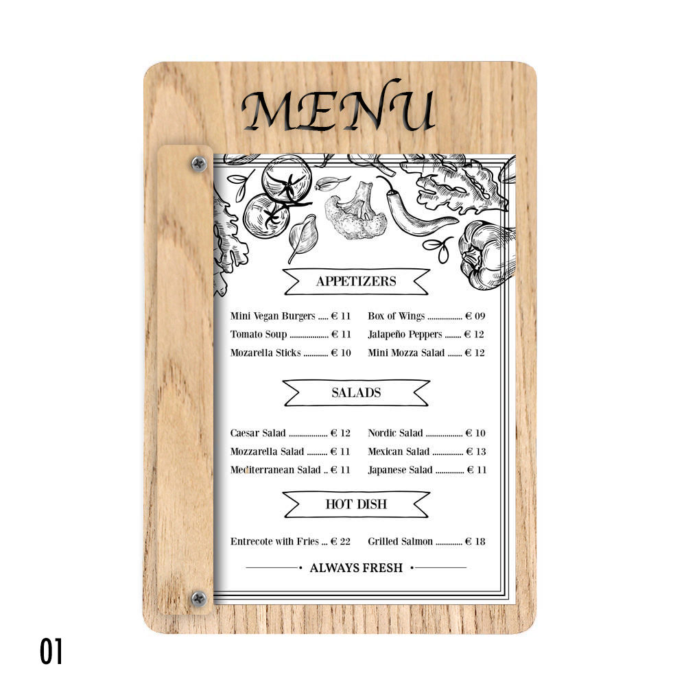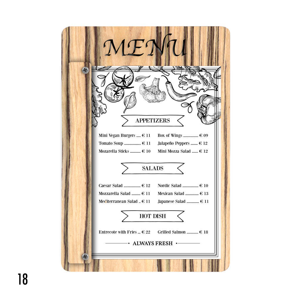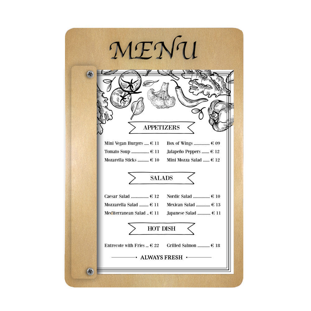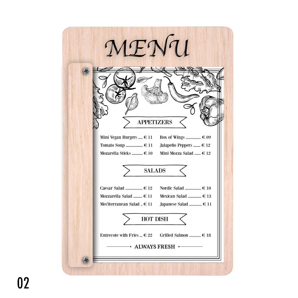 Le menu planche “tradi” est fait de bois contreplaqué d’une épaisseur de 5mm. Il comprend 5 feuilles plastiques (d’une épaisseur de 55 microns).