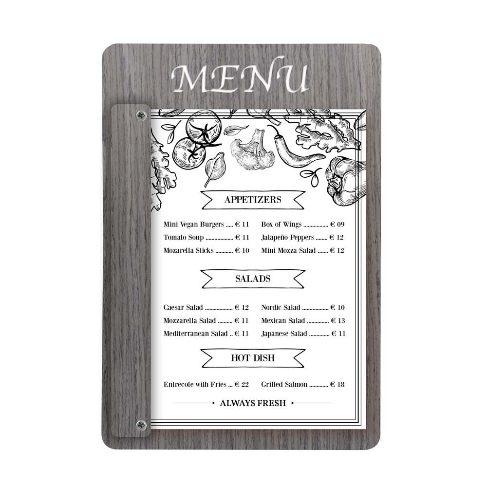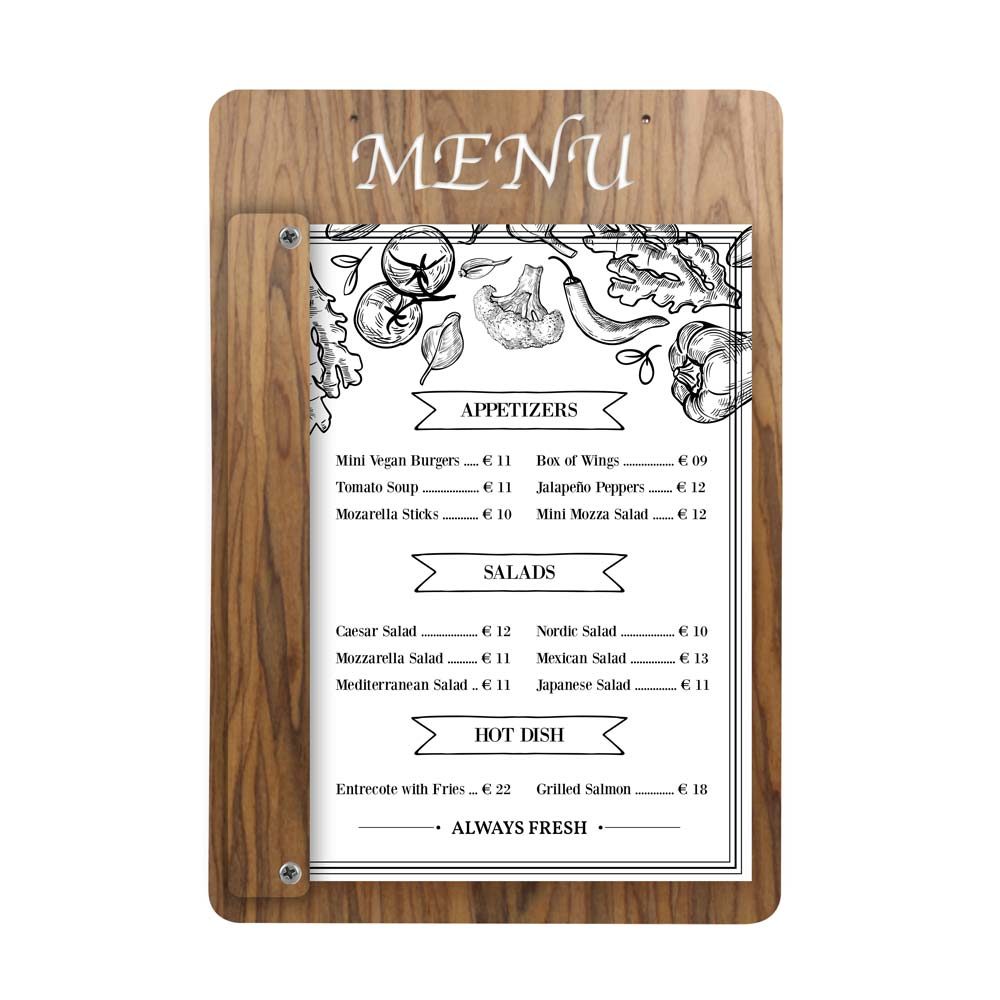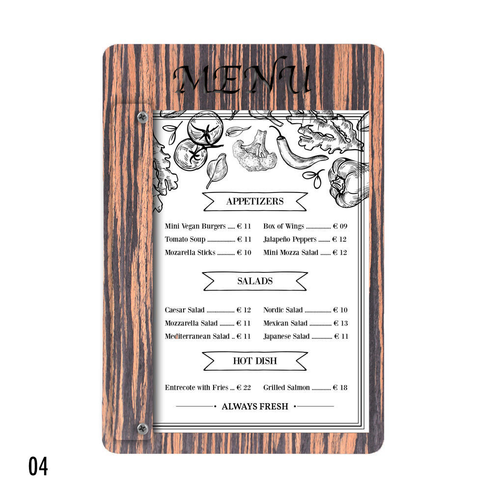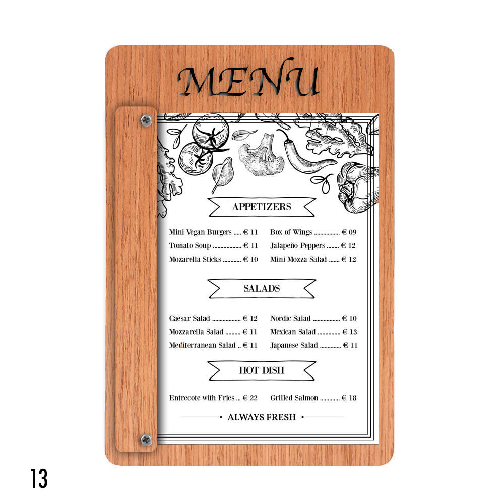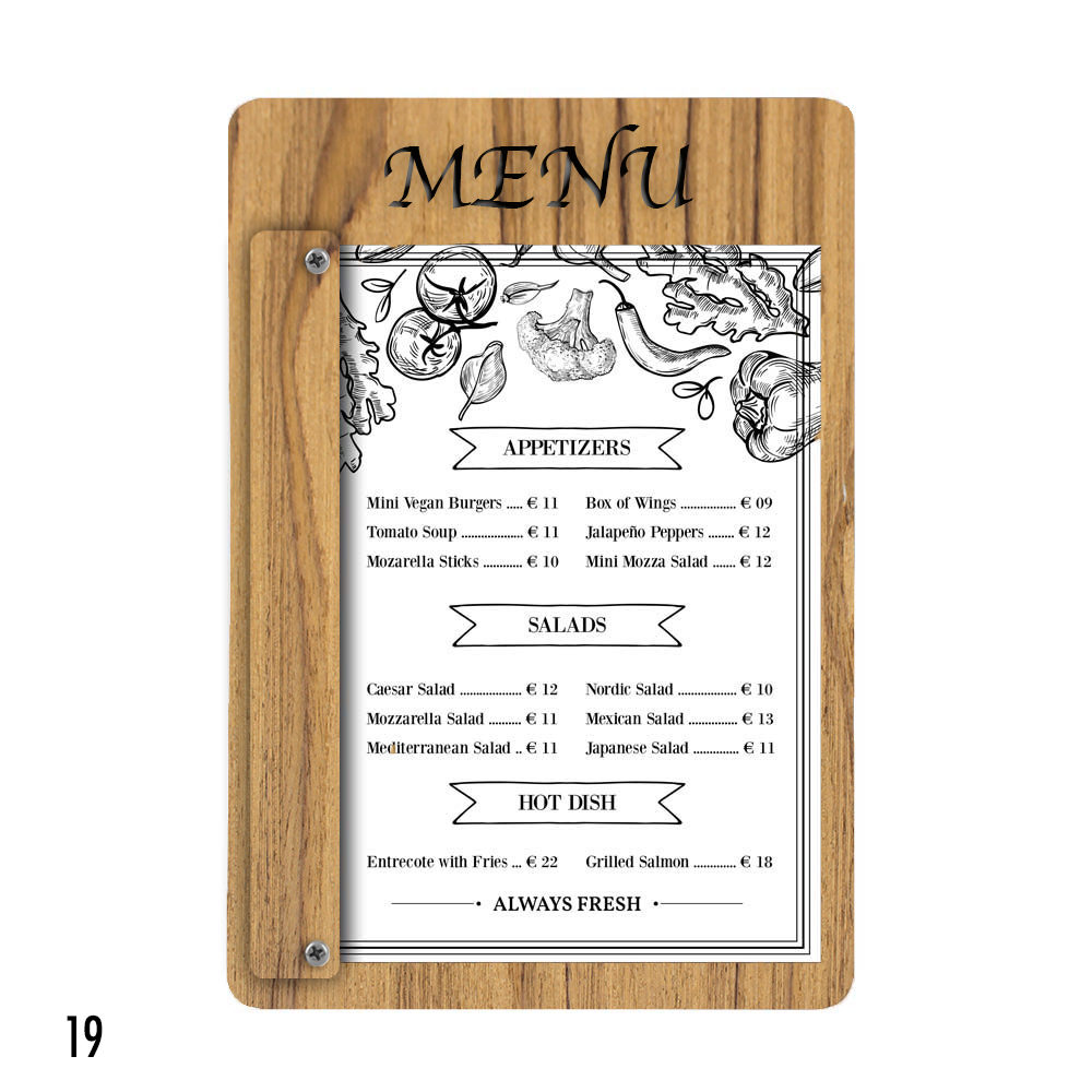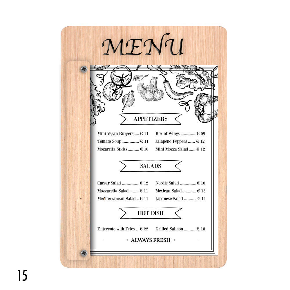 Le menu planche “tradi” est fait de bois contreplaqué d’une épaisseur de 5mm. Il comprend 5 feuilles plastiques (d’une épaisseur de 55 microns).