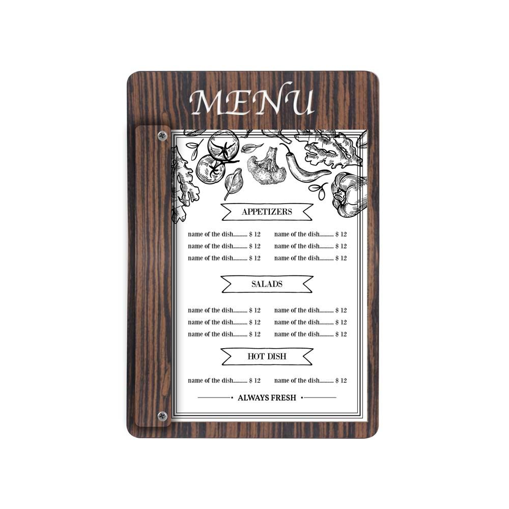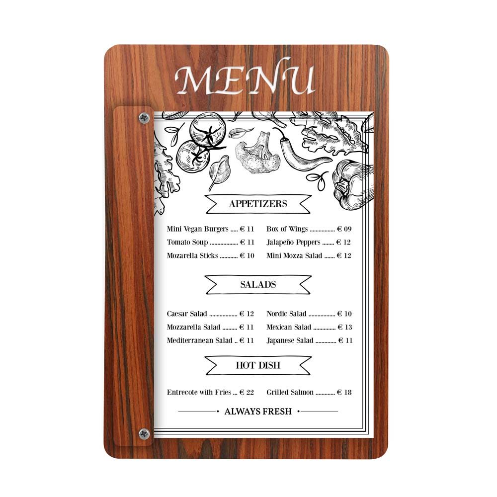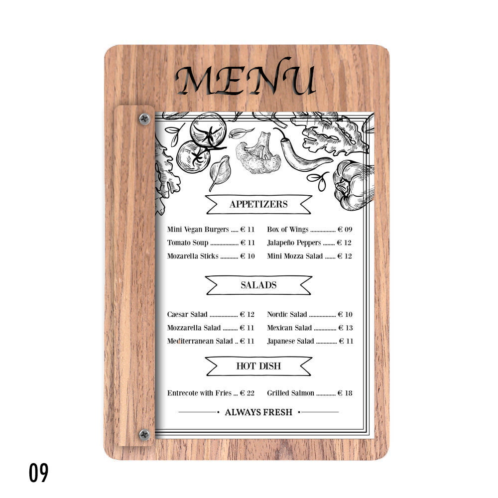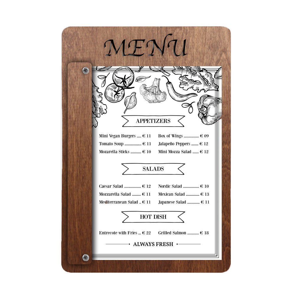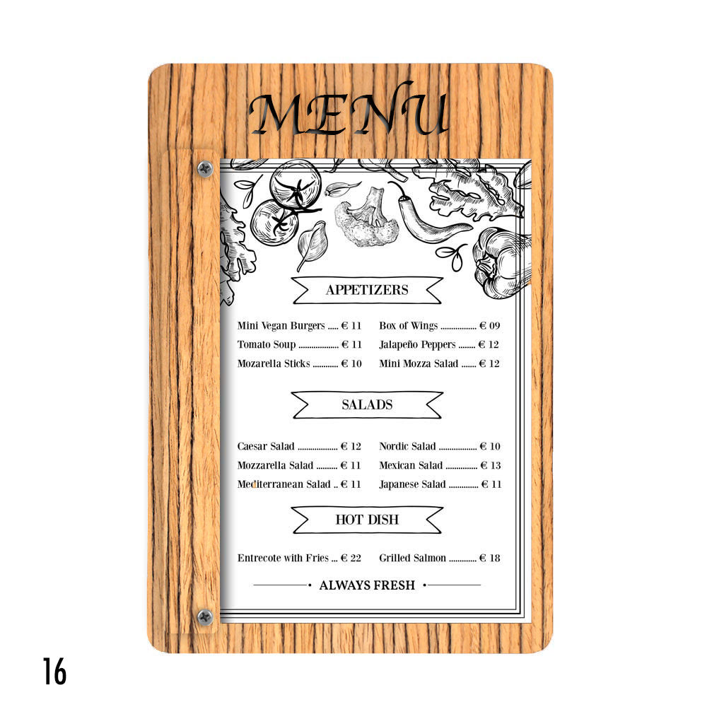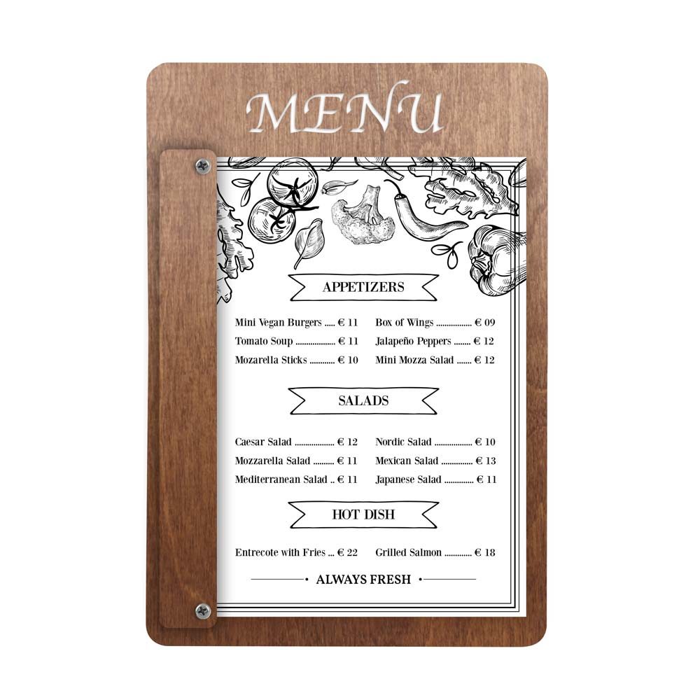 Le menu planche “tradi” est fait de bois contreplaqué d’une épaisseur de 5mm. Il comprend 5 feuilles plastiques (d’une épaisseur de 55 microns).
