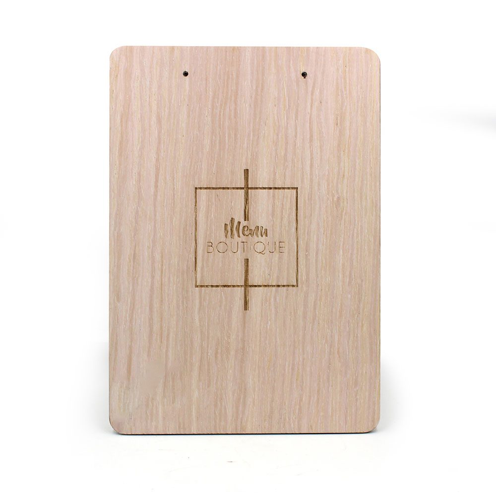 La gravure laser permet de personnalisé le menu à votre image. Elle peut s'effectuer sur le dos de la planche ou sur son côté face, sous l'emplacement des feuilles (sur une surface de 200x20mm).