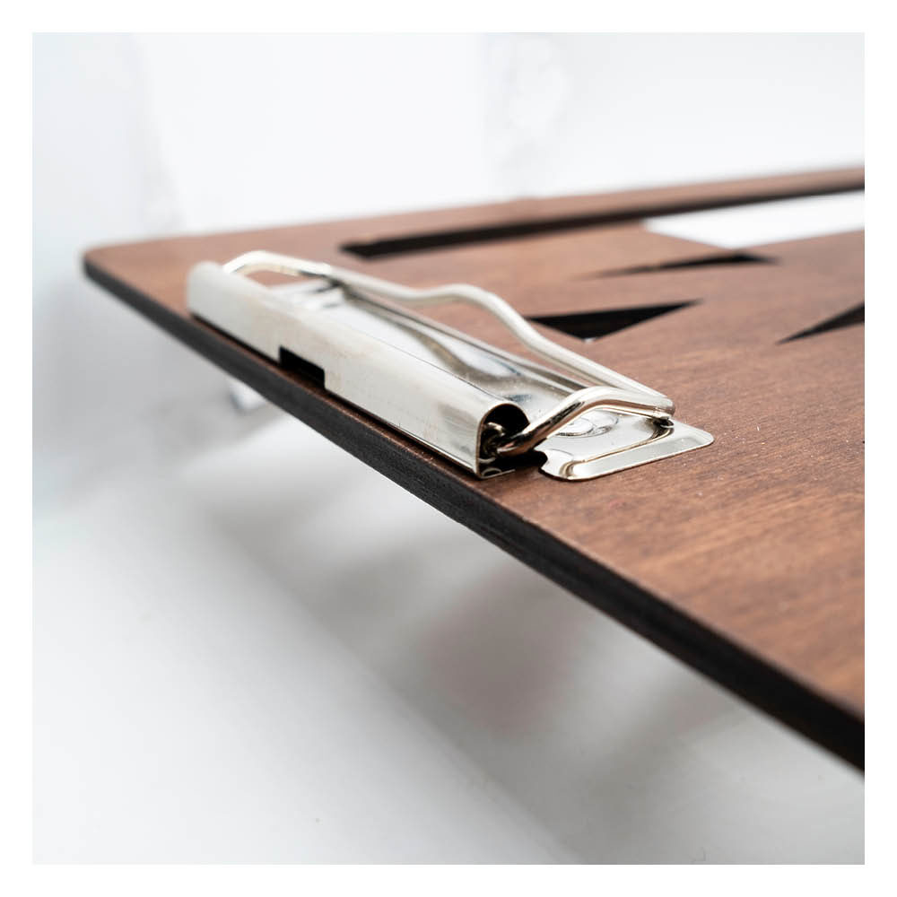 La planche est faite de bois contreplaqué d’une épaisseur de 5mm. Détail original : le clip se trouve sur le côté !