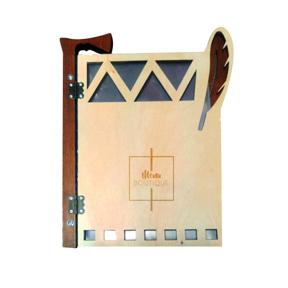 Ce menu en bois naturel contient une très belle gravure géométriques sur sa couverture et ainsi que d’une plume et d’une hache comme reliure en bois marron foncé. Aucun souci sur sa robustesse, tous les éléments sont solidement mis en place sur la couverture en bois contreplaqué d’une épaisseur de 5mm. Vous pouvez la personnaliser avec votre logo en gravure laser.